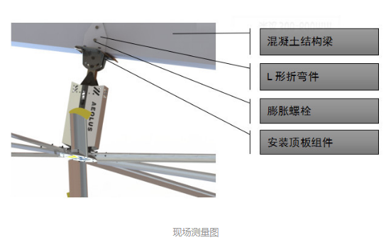 磚混結(jié)構(gòu)的安裝方式為:在混凝土梁兩側(cè)各固定一個L形折彎件(膨脹螺栓固定),梁底放置頂板和L形折彎件固定,頂板底部連接延長桿或直接連接風(fēng)扇。